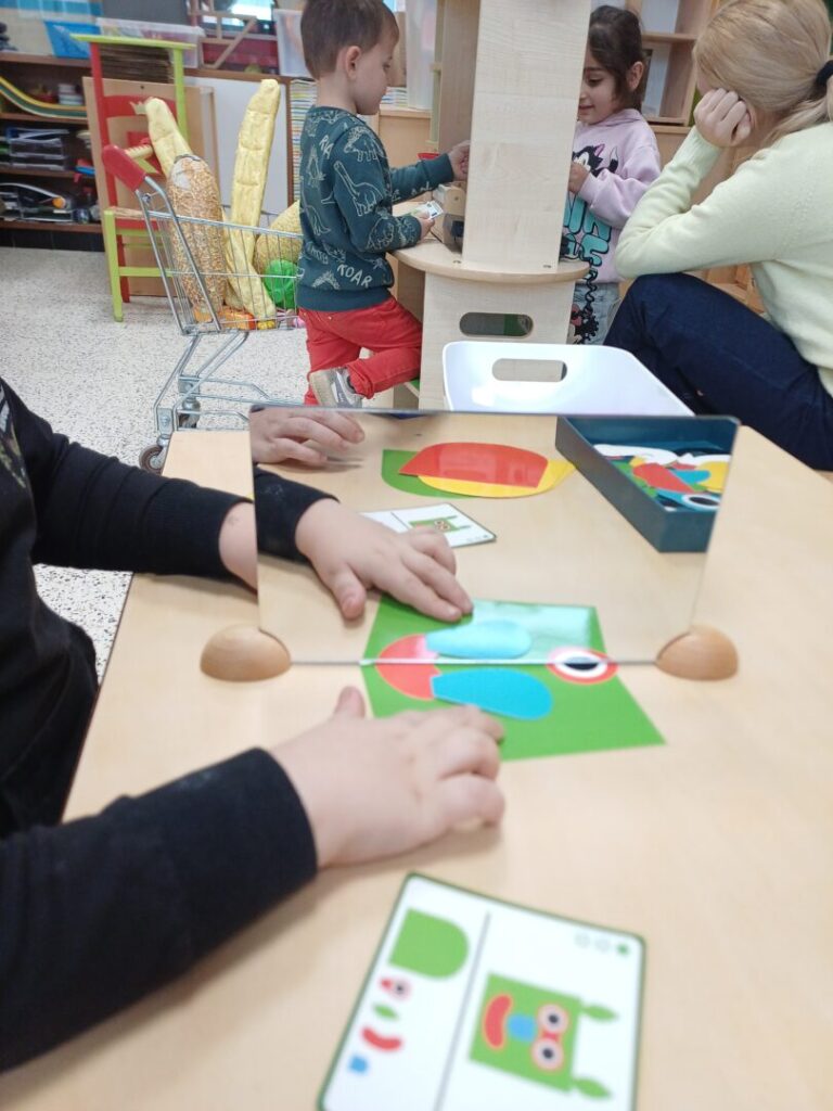 We ontdekten wat symmetrie is, bekeken ons eigen spiegelbeeld en leerden over de spiegelas. De kinderen experimenteerden volop: kijken, draaien, vergelijken… en verwonderd roepen wanneer twee helften plots één geheel vormden.
